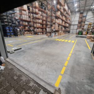 • Precyzyjne oklejenie i malowanie linii komunikacyjnych – ze względu na specyfikę podłoża konieczne było zastosowanie podkładu zwiększającego przyczepność farby, co zapewniło trwałość wykonania.